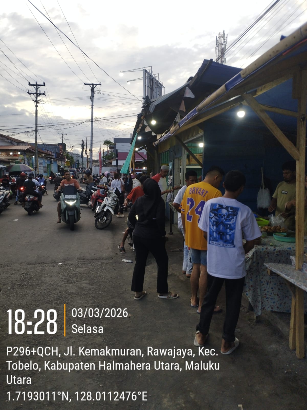 Tobelo, (Halmahera Utara ) Lintasagamanews.com — Aktivitas masyarakat menjelang waktu berbuka puasa di Kota Tobelo, Kabupaten Halmahera Utara, terpantau meningkat signifikan pada Selasa (03/03/2026). Sejak pukul 15.00 WIT hingga menjelang azan magrib sekitar pukul 18.00 WIT, sejumlah titik penjualan takjil di pusat kota dan kawasan permukiman dipadati warga.