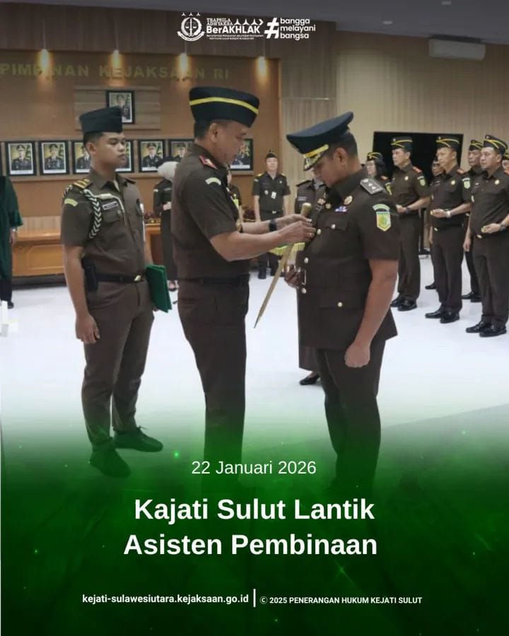 MANADO, Lintasagamanews.com — Kepala Kejaksaan Tinggi Sulawesi Utara (Kejati Sulut) Jacob Hendrik Pattipeilohy, S.H., M.H. secara resmi melantik Fahri, S.H., M.H. sebagai Asisten Pembinaan Kejaksaan Tinggi Sulawesi Utara. Pelantikan tersebut merupakan bagian dari mekanisme organisasi Kejaksaan Republik Indonesia dalam rangka penguatan tata kelola internal serta optimalisasi pelaksanaan tugas kelembagaan.