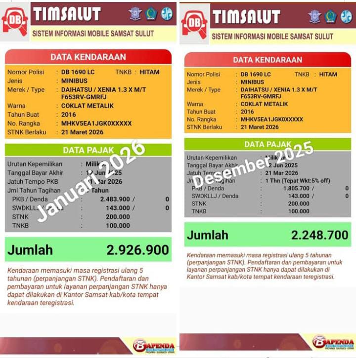 Manado, Lintasagamanews.com Kenaikan pajak yang dialami sejumlah warga Sulawesi Utara pada tahun 2026 menjadi perhatian publik setelah ramai diperbincangkan di media sosial Berdasarkan unggahan warga nominal pajak yang pada tahun 2025 tercatat sebesar Rp2.248.700 meningkat menjadi Rp2.926.900 pada 2026 atau naik sekitar Rp678.200 dalam satu tahun setara hampir 30% Senin(05/01/2026).