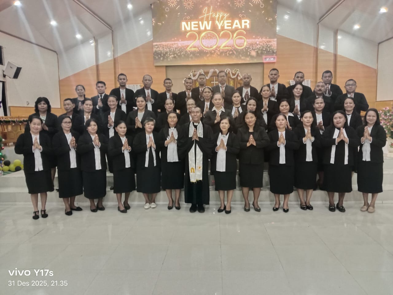 Perayaan malam pergantian tahun di Gereja Bukit Moria Pitup diakhiri dengan doa bersama dan ucapan selamat tahun baru. Suasana yang hangat dan penuh kegembiraan ini menjadi simbol harmoni sosial dan keamanan di Tobelo, Maluku Utara.