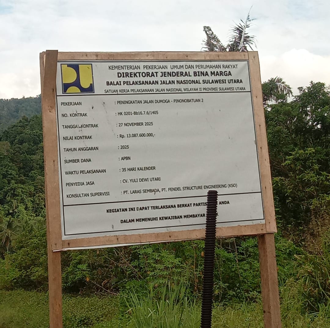 Sulawesi Utara, Lintasagamanews.com – Proyek peningkatan jalan nasional di Sulawesi Utara yang didanai APBN senilai Rp13 miliar lebih kini terbengkalai. Paket pekerjaan ruas Dumoga-Pinonobatuan 2 yang dikerjakan oleh CV Yuli Dewi Utari hanya terealisasi sekitar 30%, padahal masa kontrak 35 hari kalender telah berakhir.