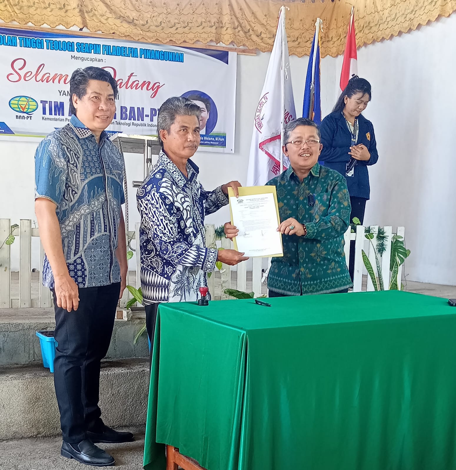 Setelah selesai melakukan Survei dan wawancara kepada seluruh mahasiswa dan dosen, di penghujung acara Tim Asesor BAN-PT RI, dan Ketua STT melakukan Penandatanganan hasil dan di lanjutkan dengan penyerahan surat keterangan Visitasi akreditasi Institusi STT SEAPIN FILADELFIA, disaksikan langsung oleh para Dosen dan Para Mahasiswa serta awak media.