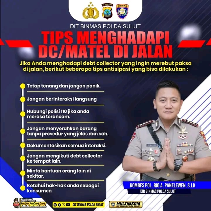 Jika anda menghadapi Debt Collector yang ingin merebut paksa kendaraan anda di jalan, berikut beberapa tips dari Dit Binmas Polda Sulut yang bisa anda lakukan :